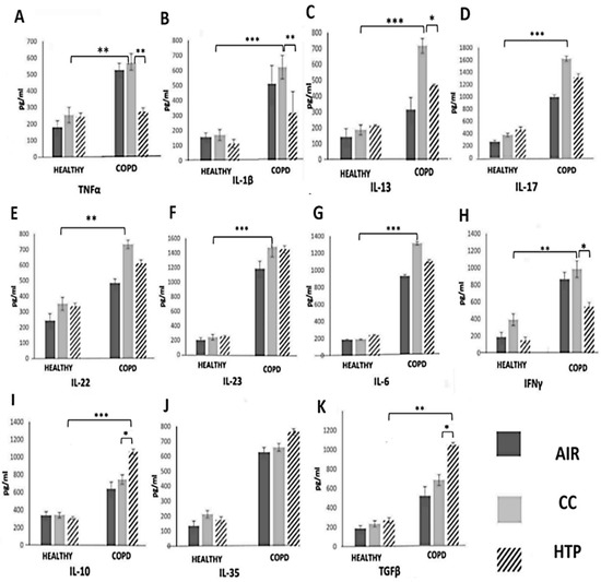 CC- and HTP-dependent effects on serum levels of inflammatory, pro-fibrotic, and immunosuppressive cytokines in healthy volunteers and COPD patients. Concentrations of TNF-α (A), IL-1β (B), IL-13 (C), IL-17 (D), IL-22 (E), IL-23 (F), IL-6 (G), IFNγ- (H), IL-10 (I), IL-35 (J), and TGF-β (K) in serum samples of healthy volunteers and COPDCC, COPDHTP, and COPDAIR patients show that both CCs and HTPs altered production of inflammatory, immunosuppressive, and pro-fibrotic cytokines in COPD patients. Values are presented as mean ± SEM; * p < 0.05, ** p < 0.01, *** p < 0.001.