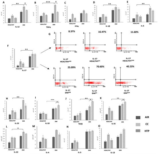Effects of CCs and HTPs on serum levels of inflammatory and immunosuppressive cytokines in healthy individuals and DM patients. Concentrations of Th1-related cytokines (IL-12 (A), TNF-α (B), IFN-γ (C)) and Th17-related cytokines (IL-1β (D), IL-6 (E), IL-17 (F), IL-23 (G)) in serum samples of healthy volunteers and DMCC, DMHTP, and DMAIR patients show that, in DM patients, CCs more efficiently enhanced the production of inflammatory, Th1-, and Th17-related cytokines compared to HTPs. CCs had weaker capacity than HTPs to induce the production of pro-fibrotic TGF-β (I) and immunosuppressive IL-10 (H) and IL-35 (J). There was no statistical difference in the concentrations of IL-22 (K) and Th2-related cytokines (IL-4 (L), IL-5 (M), IL-13 (N)) between serum samples of DMHTP and DMCC patients. Values are presented as mean ± SEM; * p < 0.05, ** p < 0.01, *** p < 0.001.