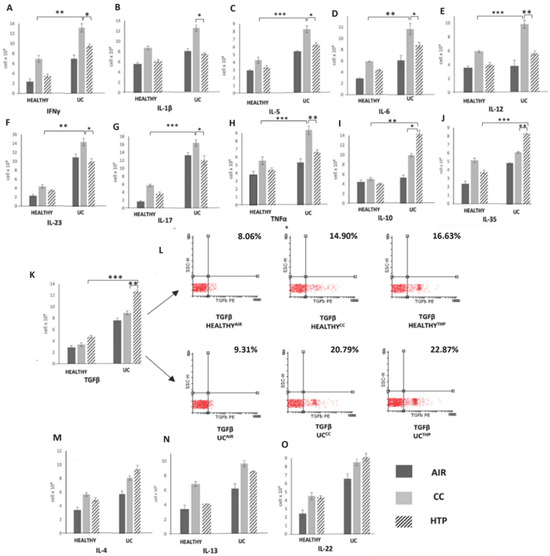 Compared to CCs, HTPs more efficiently induce the production of immunosuppressive cytokines in the immune cells of UC patients. Total numbers of IFN-γ- (A), IL-1β- (B), IL-5- (C), IL-6- (D), IL-12- (E), IL-23- (F), IL-17- (G), TNF-α- (H), IL-10- (I), IL-35- (J), TGF-β- (K), IL-4- (M), IL-13- (N), and IL-22-producing immune cells (O) in the blood of healthy volunteers and UCCC, UCHTP, and UCAIR patients, including representative dot plots (L), demonstrate the increased presence of leukocytes producing immunosuppressive cytokines in the blood of UCHTP compared to UCCC patients. Values are presented as mean ± SEM; * p < 0.05, ** p < 0.01, *** p < 0.001.