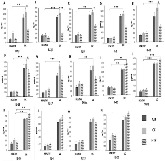 CC- and HTP-dependent effects on serum levels of inflammatory, pro-fibrotic, and immunosuppressive cytokines in healthy volunteers and UC patients. Concentrations of IFN-γ (A), IL-1β (B), IL-5 (C), IL-6 (D), IL-12 (E), IL-23 (F), IL-17 (G), TNF-α (H), IL-10 (I), IL-35 (J), TGF-β (K), IL-4 (L), IL-13 (M), and IL-22 (N) in serum samples of healthy volunteers and UCCC, UCHTP and UCAIR patients show that CCs more efficiently promoted the production of inflammatory cytokines and HTPs more efficiently induced the production of immunosuppressive and pro-fibrotic cytokines in UC patients. Values are presented as mean ± SEM; * p < 0.05, ** p < 0.01, *** p < 0.001.