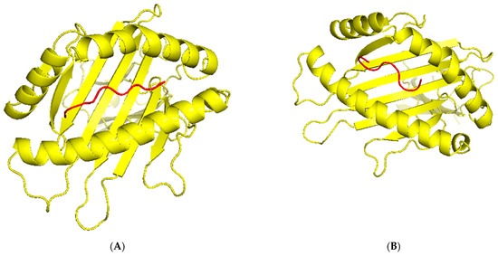 TCR (T-cell receptor) and pMHC (peptide-major histocompatibility complex) interactions play a fundamental role in immunogenicity, which involves the ability of a peptide to initiate an immune response against tumor cells. TCRs on the surface of T cells recognize antigens that are presented by MHC molecules on the surface of antigen-presenting cells. This recognition is specific to the peptide being presented by the MHC. The correct configuration and interaction of a TCR with a pMHC complex is essential for the T cell to become activated and initiate an immune response. Thus, to explore the binding of our designed peptide vaccines, we initiated TCR-pMHC peptide interaction modeling. We found the PDB files for the HLA alleles HLA-B*58:01 on the RCSB protein data bank https://www.rcsb.org/ (accessed on 23 September 2023). Using MDockPeP https://zougrouptoolkit.missouri.edu/mdockpep/ (accessed on 23 September 2023) and CABS-dock [25,26], we attached a top epitope to the binding grooves of the HLA allele. We created two models of the peptide-MHC binding complex (Figure 4). TCR binding models were created using the same method as Kim et al. [21]. We used TCRModel https://tcrmodel.ibbr.umd.edu/ (accessed on 23 September 2023) to create 3D models of a TCR complex binding to our peptide-MHC complexes. Subsequently, we used PyMOL version 2.5.5 to edit all of the 3D models. In Figure 4, yellow color represents HLA alleles, and red represents epitopes. The 3D models we obtained were KSFEDIHHY, a mutation of the KRAS gene, binding to the MHC Class I molecule HLA-B*58:01 as well as KTYQGSYGF, a mutation of the TP53 gene, binding to the MHC Class I molecule HLA-B*58:01. All pMHC-TCR 3D molecular model structures generated in this study can be found in Figure 5 and Supplementary Files S6–S9.
