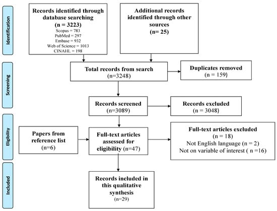 The search conducted in the five main databases produced 3223 records. An additional 25 records were produced from the search conducted in the additional databases. In all, 3248 records were produced from the search conducted. A total of 159 records were removed using Mendeley Software. Thereafter, 3089 titles and abstracts were screened by the trained graduate students and 3048 records were removed. Thus, 41 full-text records were produced from the screening of titles and abstracts. Checking of reference lists led to the discovery of an additional six eligible records. Finally, 47 full-text records were screened against the eligibility criteria. Eighteen (18) records were excluded, and 29 records were included in this meta-aggregation. Figure 1 presents a flow chart that summarizes the search results and screening process.