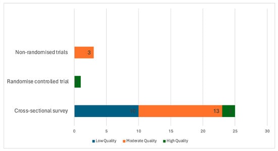 Out of the 29 studies included in this review, only 3 studies [,,] received a high methodological appraisal score. Sixteen of the studies received a moderate appraisal score [,,,,,,,,,,,,,,,], and ten received a low methodological quality score [,,,,,,,,,]. Most of the included studies lacked methodological strength. See details in Figure 3.