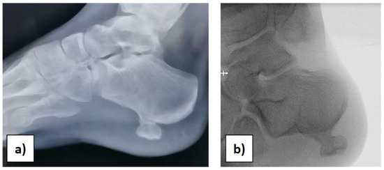 At the orthopaedic clinical examination, a stiff, immobile, and painful mass measuring approximately 2 × 1.5 cm was palpated in the heel region. The range of motion of the ankle was complete. The girl was subjected to an X-ray examination of the foot in anterior–posterior, later-lateral, and oblique projections, which revealed a 2 × 1, 5 × 1 cm pedunculated bone lesion involving the load-bearing part of the heel, arising from the posterolateral aspect of the calcaneus, with no fracture signs (Figure 1a,b).