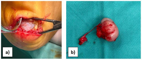Considering the results of imaging studies, the patient’s persistent and progressive heel pain, and the diagnosis of multiple exostoses disease, surgery was proposed and accepted by the family. With the patient supine and under general anaesthesia, after intravenous administration of antibiotic, antisepsis and sterile field preparation were performed; then, a transverse incision of approximately 4 cm was made on the lateral plantar side of the hindfoot. A full-thickness approach was performed to avoid damage to the neurovascular tissues, reducing the risk of skin necrosis. Subsequently, the cartilaginous cap was observed (Figure 2a), and the mass was isolated. Under magnification, the bone mass was excised through an osteotomy at the base of the pedicle (Figure 2b). Complete excision was verified by intraoperative X-ray. The surgical site was then irrigated, the tissues were closed, and the skin was sutured with resorbable suture thread in order to avoid aesthetic problems.