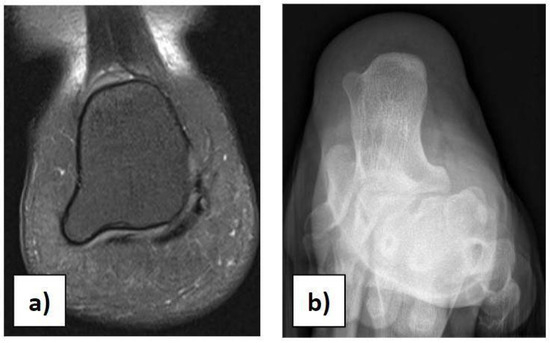 In the case of children with heel pain, it is important to perform a proper clinical assessment to make a suitable differential diagnosis, excluding traumas, occult or stress fractures, osteochondrosis, calcaneo-navicular or talo-calcaneal coalition, anatomical variations, rheumatologic conditions, infections, benign neoformations, and malignant neoformations. Anatomical variations in the calcaneus should be considered in the case of palpation of masses during physical examination [21]. We had a case of a 12-year-old girl with an incidental X-ray and MRI finding of a painless 7 × 8 mm bilateral symmetric bony mass on the infero-lateral aspect of both calcanei, without a cartilaginous cap (Figure 3a,b). She could play all sports and wear footwear without any problems and did not need any orthopaedic treatment.