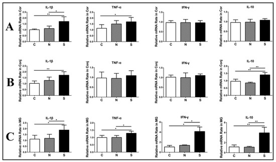 S protein induces inflammation-related cytokine upregulation in ocular surface epithelia and Meibomian glands. RT-qPCR showing the gene expression of IL-1β, TNF-α, INF-γ, and IL-10 in the cornea (A), the conjunctiva (B), and Meibomian glands (C). C, control group; N, N protein-treated group; S, S protein-treated group. Data are shown as means ± SDs; n = 6. * p < 0.05, ** p < 0.01.