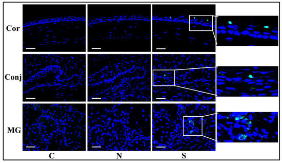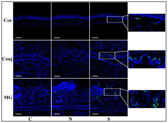 S protein induced marked TUNEL staining in the corneal and conjunctival epithelial cells and Meibomian gland acinar cells, which was scant in the N protein treatment group and the control group (Figure 5). These results indicated that S protein induced apoptosis in the cornea, the conjunctiva, and the Meibomian glands.