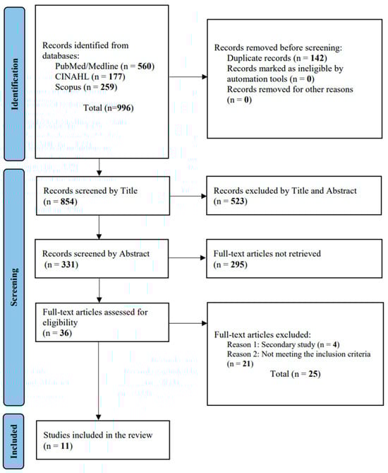 A comprehensive search of the databases found 996 articles: 560 from PubMed—MEDLINE, 177 from CINAHL, and 259 from Scopus. After removing 142 duplicates, 854 titles were screened. Of these, 331 abstracts were evaluated, and 295 were deemed irrelevant, leaving 36 full-text articles. After further assessment, 25 were excluded for not meeting our criteria. Finally, 11 studies were included in this systematic review (Figure 1).
