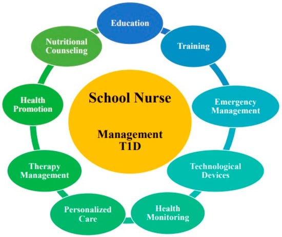 The World Health Organization (WHO) defines diabetes as one of the worst killers of our time [,]. Type 1 diabetes (T1D) is an autoimmune disease where the immune system mistakenly destroys insulin-producing cells in the pancreas, causing a severe lack of insulin needed to control blood sugar levels. Genetics often contribute to T1D, and environmental factors can also trigger it. Despite research, the exact causes of T1D are still unclear. T1D usually starts in children and adolescents but can occur at any age, including adulthood [,,]. COVID-19 infection, along with various environmental factors, appears to have significantly contributed to an exponential increase in this condition. Recent studies suggest that SARS-CoV-2 may trigger the autoimmune destruction of β-cells, potentially increasing the incidence of T1D [,]. In addition, questionable behaviors such as smoking, alcohol consumption, sedentary lifestyle, and improper diet play a decisive role in the management and glycemic compensation of both T1D and other forms of diabetes, including Type 2 diabetes (T2D) and gestational diabetes [,,,,,,,]. There is increasing evidence supporting the clinical management of T1D through technology [,,]. About 1.52 million people worldwide are affected by T1D. In Italy, according to data from the Italian National Institute of Statistics (ISTAT) in 2018, there are approximately 300,000 individuals with T1D. Of these, about 10% use Continuous Subcutaneous Insulin Infusion (CSII), and only 39% use devices for Continuous Glycemic Control (CGM) [,,,]. The other 51% of individuals with T1D usually manage their condition using multi-injected insulin therapy. A more modern approach to managing T1D in all aspects of daily life, especially for populations like the younger generation, is increasingly recommended and supported by solid evidence in favor of technological devices [,,,,,]. In this context, a school nurse (SN) could act as a true manager of care in heterogeneous contexts, both in terms of resources and management [,,]. For these main reasons, specific pathways have been developed in recent years, especially nursing-oriented ones, for clients using CSII and CGM who increasingly require highly specialized care []. This review aims to explore the role of SNs in managing pediatric patients with T1D who use technological devices in a school setting.