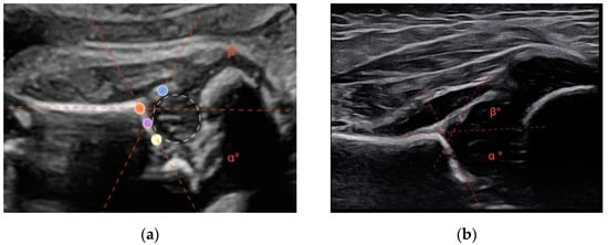 A modified Graf method was performed. This involves acquiring a lateral scan of the newborn’s hip. Similarly to the Graf method for infants, the alpha angle is defined as the angle formed between a line tangent to the iliac wing and a line tangent to the bony roof. The beta angle is formed by the line tangent to the iliac wing and a line tangent to the cartilaginous roof [,] (Figure 1).