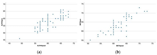 (a) Scatter plot prenatal/postnatal α-angles (b). Scatter plot prenatal/postnatal β-angles.