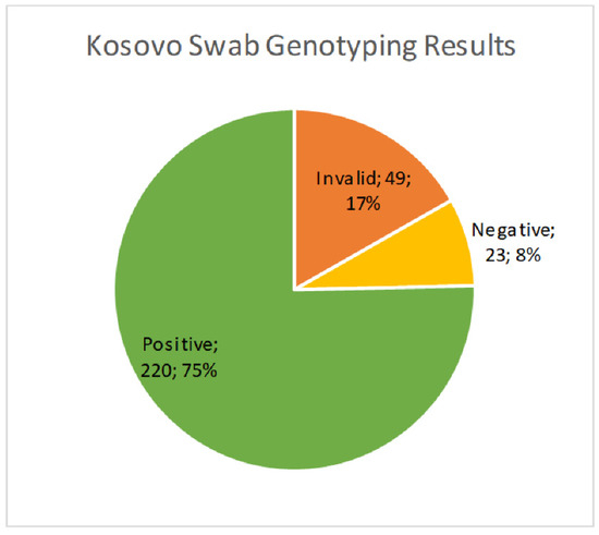 We received 1994 cervical brush samples from the University of Prishtina, Kosovo. Samples were screened for hrHPV with an isothermal method as described above. Of the 1994 samples, 69 (3.5%) resulted as invalid, 1633 (81.9%) were negative, and 292 (14.6%) were positive (Figure 1). Results were considered invalid if amplification of an HPV target or the internal control was not achieved. Possible reasons included lack of DNA in the sample, challenges with sample collection, lack of full suspension in lysis buffer, sample degradation, or the presence of PCR inhibitors. All positive samples were then genotyped for hrHPV using a real-time PCR melt curve analysis as described above. Of the 292 screened positive samples, 49 (16.8%) were invalid, 23 (7.9%) were negative, and 220 (75.3%) harbored an hrHPV genotype (Figure 2). Invalid results did not have amplification of hrHPV or the internal control, and negative results did not show amplification of the hrHPV target, but did have amplification of the internal control. The genotyping assay used for this study differentiated among 14 hrHPV types. The number of positive samples and percent for each hrHPV type are shown in Table 1. HPV types 51 and 16 were found to have the highest prevalence (8.8% and 4.5%, respectively) in this patient population of screening cervical brush specimens (Figure 3). In addition, of the positive screening samples, 90% of participants further tested for genotype determination had either one or two detectable hrHPV types, 8% had three concomitant identifiable genotypes, and less than 1% were positive for four or more hrHPV genotypes.