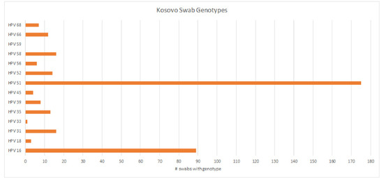Trends of increasing cervical cancer rates and mortality have been documented in Central and Eastern European countries, with an estimated overall prevalence of 10.6% of women harboring hrHPV in 8610 normal cytologies [32,37,38]. Notably, in this cohort, the most prevalent hrHPV genotypes were 16 and 18, which comprised approximately 4.0% of all cases [32,39]. Rare studies have previously examined the prevalence of HPV genotypes in Kosovo [21,22,40]. Our cohort in Kosovo showed a higher overall prevalence of hrHPV infection (14.6%) when compared to the aforementioned larger studies, which reported a hrHPV prevalence of 10.6% in the screened women of Central and Eastern Europe [32,37]. Our finding corroborates a previous study in Kosovo that found 13% of the screening cervical cytologies were positive for hrHPV [22]. That study also found a predominance of hrHPV genotypes 16, 31, and 51, which is similar to our cohort from Kosovo, that showed a prevalence of HPV genotypes 16 and 51 in 292 screening samples [22]. Large-scale studies in other Eastern European countries did not identify hrHPV 51 as one of the most common genotypes in screening samples [22,39]; however, a study in Wales identified HPV 51 as a predominant genotype in screened women [41].