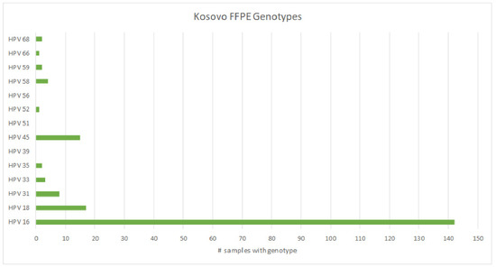 Despite the advancements in HPV detection and opportunities to impact HPV-related disease progression by improved screening methods, access to these preventative resources has not significantly expanded to LMICs. While many countries in Eastern Europe have adopted cervical cancer screening programs, the overall prevalence of hrHPV in some countries, including Kosovo, remains higher than surrounding regions, perhaps due to challenges with implementing an organized screening program and limitations to vaccination. Fortunately, in the last 8 years, over 15,000 women have been screened, with 4.2% of the more than 2000 women showing atypical Pap results [45]. Since a national HPV-cotesting program has not yet been established, our results are informative for understanding the overall burden of hrHPV in screened women in Kosovo, as well as the hrHPV genotypes most identified in cervical malignancies. There are additional limitations to our study, which include a lack of demographic information on the cohort of consented patients in this study. Future studies should include this information to highlight the most at-risk age groups in Kosovo. Further, since the focus of this study was to examine the overall prevalence of hrHPV genotypes, we did not include all the demographic information about the cervical tumor samples. The distinction between tumor subtypes in relation to the hrHPV genotype coupled with the patient’s demographic information would be informative to bolster population health data and vaccination efforts.