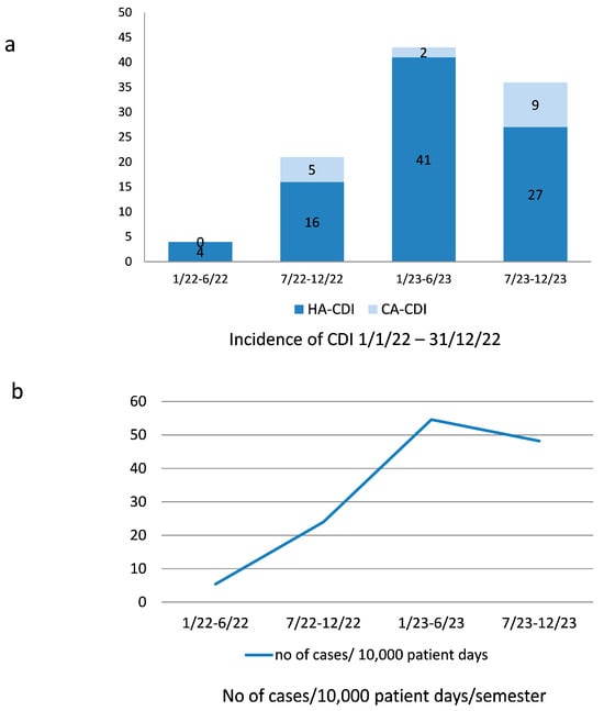 Up to 31 December 2023, incidence of CDI among inpatients of medical wards of Hippokration Hospital. (a) Total cases of community-acquired (CA) CDI and healthcare-associated (HA) CDI per semester. (b) CDI incidence in cases/10,000 patient days.
