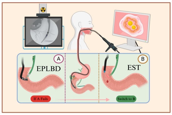 - Aziz, M.; Khan, Z.; Haghbin, H.; Kamal, F.; Sharma, S.; Lee-Smith, W.; Pervez, A.; Alastal, Y.; Nawras, A.; Thosani, N. Endoscopic sphincterotomy vs papillary large balloon dilation vs combination modalities for large common bile duct stones: A network meta-analysis. Endosc. Int. Open 2022, 10, E1599–E1607. [Google Scholar] [CrossRef]