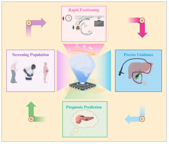 Diagram illustrating the application of artificial intelligence in ERCP. The roles of artificial intelligence are as follows: A. Screening populations at high risk for gallstones, B. Reducing both surgery time and the radiation exposure for doctors and patients, C. Constructing guidance pathways for biliary cannulation, D. Predicting the likelihood of complications such as post-ERCP pancreatitis.