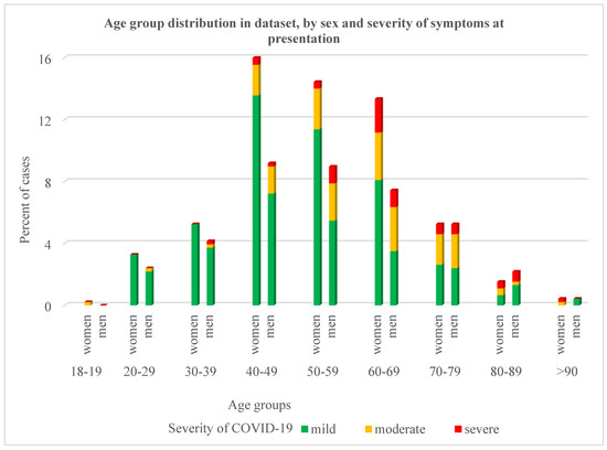 The mean age of patients at presentation in the CEC-CD was 53.85 (range 18–91) years old; most of them belonged to the age group 40–69 years (73.4% of women; 63.9% of men) and had mild clinical COVID-19 symptoms (Figure 1).