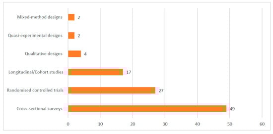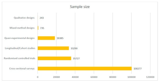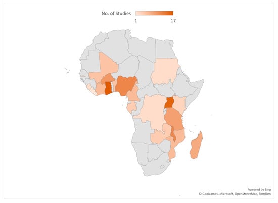 Most of the included studies were conducted in Ghana (17), Uganda (16), Malawi (12), Nigeria (12), and Burkina Faso (10). See the details of where the studies were conducted in Figure 2. Out of the 101 included studies, 49 were cross-sectional surveys. See Figure 3 for details on the study types. A total of 188,657 samples were used in the included studies. Details on the sample size according to the different study designs are presented in Figure 4.