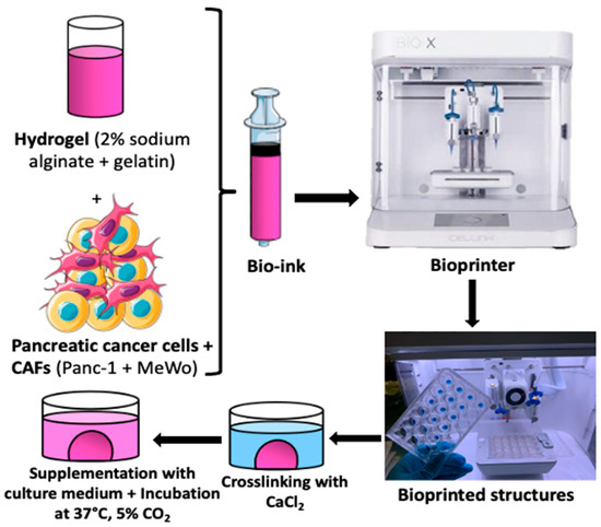 Currently, the development of new drugs is mainly based on the use of two-dimensional (2D) cell culture and animal models. It is obvious that even if the 2D cell culture models have been proven for years, they only partially reflect the tumor complexity, mostly due to its monolayer cell organization [9]. In addition, in vivo animal testing also raises translational concerns. Indeed, the metabolic pathways involved in animals are not the same as those present in humans, which can create differences when molecules are transferred to the clinical phase [13,14]. The three-dimensional (3D) models have been shown to overcome these limitations through the development of organoids, spheroids, human xenografts, and explants [15,16,17]. Lazzari et al. (2018) [18] attempted to integrate human umbilical vein endothelial cells (HUVECs) into PDAC spheroids but failed to form blood vessel-like structures. Kuen et al. (2017) [19] included macrophages in PDAC spheroids, showing their infiltration and adoption of a tumor phenotype. Liu et al. (2021) [20] developed a heterospecific spheroid model to study the interactions between pancreatic tumor cells and stellate cells, simulating the characteristics of CAFs. Other studies, such as those by Lee et al. (2020) [21], used organoid models to reproduce the PDAC tumor microenvironment and observed an increase in cell migration and expression of tumor markers in the presence of stroma. Nevertheless, their engineering still faces challenges in terms of poor reproducibility in size and architecture [22]. Furthermore, there exist in vitro three-dimensional (3D) models derived from patient cells, including patient-derived organoids (PDOs) and patient-derived explants (PDEs). PDOs are three-dimensional structures cultivated from tumor cells isolated from patients, while PDEs consist of segments of whole tumor tissue that are directly obtained from patients and subsequently cultured in an in vitro environment. PDOs, for example, offer a closer approximation of the patient’s tumor with respect to genetic and phenotypic characteristics, rendering them highly valuable for personalized medicine approaches. Conversely, PDEs preserve the tissue architecture and microenvironment, facilitating the investigation of tumor–stroma interactions within a more natural context. Both PDOs and PDEs surpass traditional cell line models by maintaining the heterogeneity of the tumor, which is essential for comprehending treatment responses and resistance mechanisms. Additionally, these models can be employed for high-throughput drug screening, yielding more reliable and predictive data for preclinical assessments; however, they necessitate prolonged cell culture periods and present challenges in accessibility compared to immortalized cell lines. The effort to constantly improve cancer models has turned to the 3D bio-printing technique in the last decade [13,23,24]. This technique allows for overcoming the issues encountered in the development of classical 3D models by providing complete control over the size, architecture, and composition of the synthesized tumor mass [25,26]. Extrusion-based 3D bio-printing is mostly used as it enables (i) the deposition of multiple or selected cell types and (ii) working in compatible laboratory workflows, thus building multimaterial multicellular 3D models that reproduce physiological features of the tumor. The potential of extrusion bio-printing to recreate the tumor microenvironment within in vitro models has been recently reviewed by Flores-Torres et al. (2023) [27]. The focus of 3D bio-printing has been almost exclusively on breast, ovarian, and brain cancers [28,29,30,31,32,33,34]. Only a limited number of 3D bio-printing models of PDAC have been reported so far. A laser-assisted bio-printing model comprising different lineages of pancreatic cells turned out to be an attractive 3D cell model for studying the tumorigenesis of PDAC [9]; another report by Langer et al. (2019) [35] addressed extrusion-based bio-printing using patient-derived xenograft-derived PDAC. The authors demonstrated that patient-derived PDAC bio-printed tissues can recapitulate aspects of neoplastic tissues in vivo. The recent study by Sgarminato et al. (2023) [36] proposed an original approach to creating a 3D model of PDAC using melt electrowriting and conducted a layer-by-layer deposition of different cell types without mixing them together before the deposit. Many more studies performed by 3D bio-printing were reported in the context of dysfunction of the endocrine part of the pancreas, causing diabetes [37,38]. One of the best models describing the generation of the PDAC model by bio-printing is the one built by Hakobyan et al. (2020) [9], and it is restricted by its monoculture with only pancreatic cells, creating a lack of interaction with other cells of the microenvironment. To the best of our knowledge, only one work describes the bio-printing by extrusion of pancreatic and fibroblasts for PDAC. This work describes a process developed to generate PDAC models by bio-printing cell-laden gelatin methacryloyl (GelMA) hydrogel beads through dot extrusion printing [39]. The cells used in this work were the human pancreatic cancer cell line (BxPC-3) and normal human dermal fibroblast cells (NHDFs) to better mimic the tumor microenvironment. Another alternative is to use direct co-culturing of tumor cells with cancer-associated fibroblasts (CAFs). Such an approach can shorten the fabrication time of relevant tumor models, address different tumor stages, and overall provide a high-throughput platform for anti-cancer drug screening. CAF-enriched models indeed have many similarities with tumors in terms of up-regulated genes, cytokine production, growth factors release, etc. [35,36,37]. A 3D bio-printed model of ovarian cancer cells and myofibroblasts, MeWo (the latter stands for CAFs), was also recently described and characterized [31]. The interesting work of Wei et al. (2