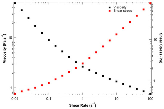 Evaluation of the shear-thinning behavior of bio-ink: viscosity (black) and shear stress (red) vs. shear strain rate.