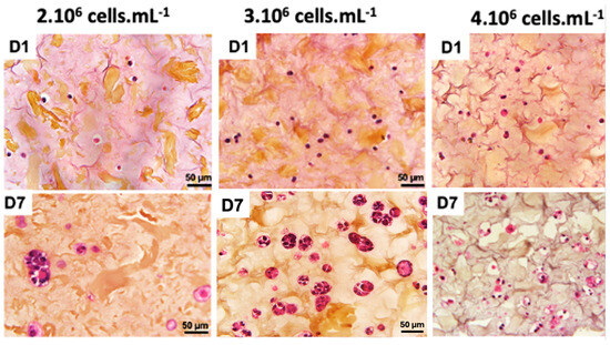 A recent study demonstrated that the final cell concentration of 1·106 cells·mL−1 was not sufficient to form a 3D cellularized object [30]. A cell concentration of 2·106 cells·mL−1 also provided hardly visible cell density (Figure 3). When cell concentration was doubled to 4·106 cells·mL−1, we could observe a 3D cellularized object formation; however, cell proliferation was too high and led to massive cell death over the days. We observed that the cells are more numerous and closer together, no longer limited by their interactions. However, after 7 days of culture following bio-printing, the majority of cells were dead. This mortality is visually assessed by the degradation of the nucleus, which appears to “burst”, and the rapid degradation of the extracellular matrix, visually assessed by the formation of pores represented by whitish areas on the periphery of the cells. An intermediate cell concentration of 3·106 cells·mL−1 appeared as a good compromise between the two above-mentioned ones.
