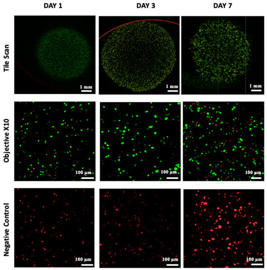 The experiments were performed on days 1, 3, and 7 after bio-printing. For each time point, negative controls (NCs) (structures containing only dead cells) were prepared by exposing the bio-printed structures to 70% methanol for 30 min before treatment with Live/Dead kit reagents.