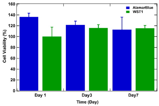 WST-1 and AlamarBlue assays performed on bio-printed structures to evaluate cellular activity over time. For both tests, the results are expressed as a percentage of cellular viability after numeric treatment and normalization to the highest value (on day 3), defined as 100% of cellular viability. Three independent experiments were performed. Errors bars correspond to standard deviations.