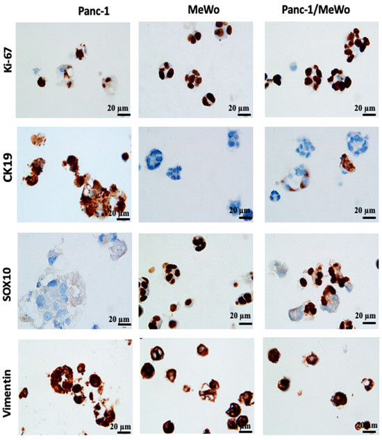 The following markers were used: Ki67 [42] for cell proliferation, cytokeratin 19 (CK19) [43] for pancreatic cell staining, HMG-box 10 (SOX10) for MeWo cells [44], and vimentin for mesenchymal cell types [45,46]. The specific antibodies used are listed in Table 4.