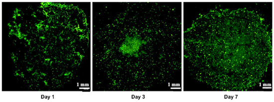 Cell viability, which is essential for achieving functional cellular outcomes, was evaluated in bio-printed co-culture tumor models using the Live/Dead assay and confocal microscopy imaging [9,49]. The corresponding results are presented in Figure 4. One day after bio-printing, the majority of the cell population displayed green fluorescence, indicating high cell viability in the bio-printed structures. Significantly, this high viability, sustained on days 3 and day 7 post-bio-printing, aligns well with the findings of Liu et al. (2019) [50], who studied the cell viability of endothelial cells in co-culture within a hydrogel post-bio-printing, and with the research by Ermis et al. (2023) [6], who examined the viability of pancreatic spheroids in a hydrogel through 3D bio-printing. In this study, we observed an increase in the intensity of green fluorescence on day 7 compared to day 1. This increase can be attributed to the growth of the cell population through cell proliferation within the bio-printed structures. Additionally, there may be cell migration towards the periphery of the structures, necessitating further investigation. These results suggest that, visually, the 3D bio-printing process has no significant impact on cell viability.