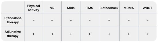 Next, the prepared database was reviewed by examining titles and abstracts. The review was conducted independently by three authors. We excluded works unrelated to our research questions, and animal studies. Finally, our narrative review included 116 studies. From each study, we extracted data regarding study characteristics (authors, year, additional details), limitations, patient count, and key findings. Data are presented in Tables S1–S6 for the first search and in Table S7 for the second search. Tables are available in Supplementary Materials. We presented the results of our narrative review as a set of chapters describing the following identified alternative treatments in sequence: physical activity, VR technology, mindfulness, neurostimulation (we mainly focused on TMS), biofeedback, and other methods, such as EMDR therapy, vagus nerve stimulation, adjuvant MDMA treatment, cryotherapy, barotherapy, and herbal treatment.