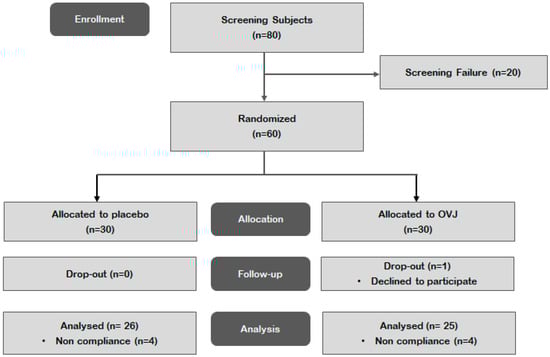 We recruited 80 participants, enrolling the 60 who met the inclusion criteria, and randomly assigned them to two groups. A total of 59 participants completed the study. Among them, eight did not meet the intake compliance criteria (<80% treatment compliance), and one dropped out owing to withdrawal of consent during the study, thus being excluded from the analysis. Therefore, 26 and 25 participants in the placebo and OVJ groups, respectively, were included in the data analysis (Figure 1). No side effects after consuming the test food were reported as reasons for rejection. The participants’ baseline characteristics are listed in Table 3. The two groups were well matched for age, sex distribution, smoking, and drinking. They also exhibited no significant differences in anthropometric variables and vital signs.