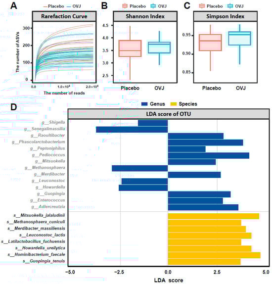 Microbiome analysis results. The graphs show the (A) rarefaction curve, (B) Shannon index, (C) Simpson index, and (D) LDA score of OTU increased or decreased strains in the OVJ and placebo groups after 4 weeks of intervention.
