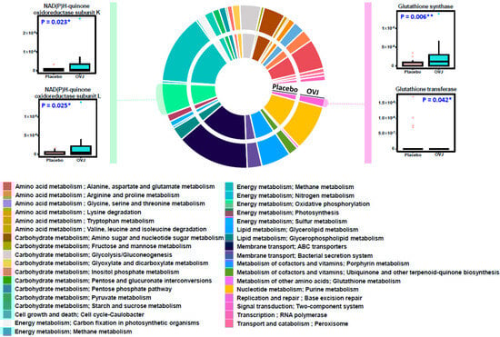 Based on the above results, an analysis was conducted using the PICRUSt2 and KEGG databases to predict changes in the function of intestinal microorganisms (Figure 3). Evidently, 240 Kegg Orthology (KO) identifiers significantly differed between the OVJ and placebo groups. Among the significant KO identifiers, four were included in the oxidative phosphorylation and GSH metabolism categories.