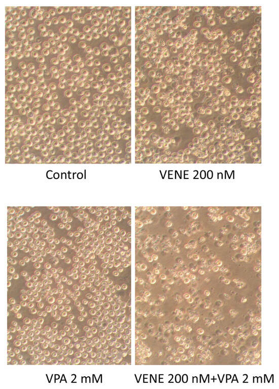 Cell morphology was observed under a microscope following treatment of KG-1 cells with venetoclax, with or without VPA (Figure 2). Neither VPA nor venetoclax alone caused any significant morphological changes. However, the addition of VPA to venetoclax treatment resulted in numerous cells exhibiting shrunken and broken morphologies. These morphological changes are consistent with the cell growth inhibition observed in Figure 1.
