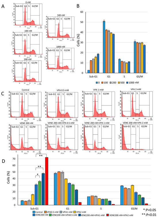 Venetoclax and VPA induce sub-G1 population and decrease other cell cycle phases. Cell cycle analysis of PI-stained KG-1 cells treated with venetoclax alone (A) and in combination with VPA for 48 h (C). Representative histograms (A,C) and a bar graph (B,D) are shown. Data represent mean ± S.D. (n = 3).