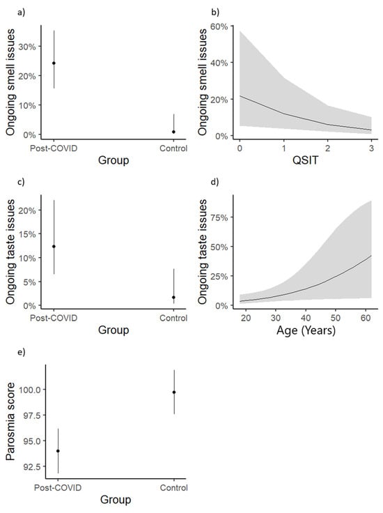 Significant influences on the prevalence of ongoing smell and taste issues and parosmia. Predictors of olfactory dysfunction in post-COVID-19 patients (n = 82) and control group (n = 82). Associations are shown between ongoing smell issues with group (a) and QSIT score (b), between ongoing taste issues with group (c) and age in years (d), and between parosmia with group (e). Parosmia Score equation: (Total Score − 4)/12) × 100. Error bars and shaded areas represent the 95% confidence interval around model estimates.. QSIT = Quick Smell Identification Test.