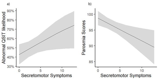Association between higher secretomotor symptom scores as per Composite Autonomic Symptom Scale 31 (COMPASS-31) questionnaire item totals with more likely abnormal QSIT (scores of 2 or lower) (a) scores and worse parosmia scores (b). Logistic (abnormal QSIT score) and linear (parosmia score) regression model estimates were derived while adjusting for participant age, smoking status (past or present smoker vs. never), and duration since COVID-19 infection. Shaded areas represent the 95% confidence interval around model estimates. QSIT = Quick Smell Identification Test.