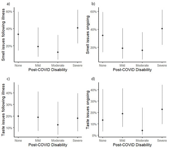 There were no significant differences between disability groups in having experienced issues with smell either following acute illness (χ2 = 5.91, p = 0.116) (Figure 3a) or at the time of the interview (χ2 = 4.43, p = 0.218) (Figure 3b). Similarly, there were no differences in the prevalence of taste issues following acute illness (χ2 = 0.545, p = 0.919) (Figure 3c) or at the time of the interview (χ2 = 4.15, p = 0.246) (Figure 3d). These associations are shown in Figure 3.