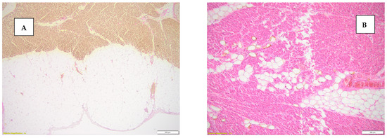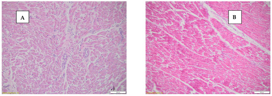 (A) Myocardial tissue with fragmented cardiac fibers, HE stain, 20×. (B) Myocardial tissue with intact, unfragmented fibers, HE stain, 20×.