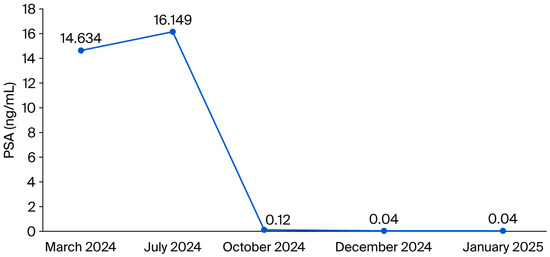 In July 2024, given the increased PSA value to 16.149 ng/mL, the patient accepted the beginning of the androgen deprivation therapy. The therapeutic response was prompt and marked: upon the October 2024 assessment, the PSA value had decreased to 0.12 ng/mL, and the recorded testosterone value was at castration level, confirming the effectiveness of the hormonal therapy. In the following months, PSA values became almost undetectable, remaining below 0.05 ng/mL until January 2025, which suggests clear biochemical remission (Figure 1).