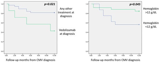 Vedolizumab treatment at diagnosis and hemoglobin levels less than 12 g/dL were independently associated with colectomy during the first year of follow-up (Kaplan–Meier Log Rank: p = 0.021 and p = 0.045, respectively).