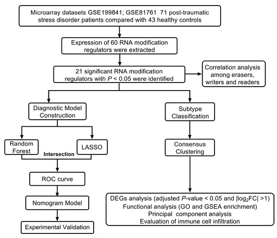 To address this issue, we conducted a comprehensive analysis of the impact of RNA modification-related genes (RMGs) that encode writers, erasers, readers, and other regulators involved in dynamically regulation of modified RNAs on the identification of diagnostic biomarkers and subtypes of PTSD using GEO database with samples from blood. A gene model for predicting susceptibility to PTSD was created using 8 feature RMGs to offer significant clinical advantages for patients. Additionally, RT-qPCR experiments confirmed the 8 feature RMGs, showing similar expression levels to the bioinformatics findings. The workflow diagram is depicted in Figure 1.