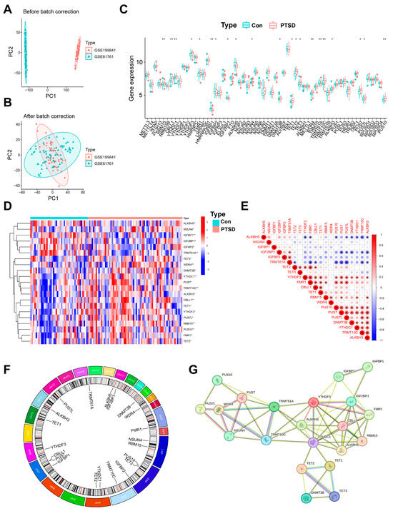Identification of 60 RMGs in Con and PTSD samples. (A,B) A before-and-after de-batching process of 114 samples from the two databases. (C) A boxplot illustrating the differential expression of the 60 RMGs between PTSD and Con. (D) A heatmap showing 21 differential RMGs in the PTSD and Con. (E) Correlations among 21 RMGs. (F) The chromosomal positions of 21 RMGs. (G) A network analysis visualizing the interactions among RNA modification regulatory proteins using data from the String database. Statistical annotations: * p < 0.05, and ** p < 0.01.