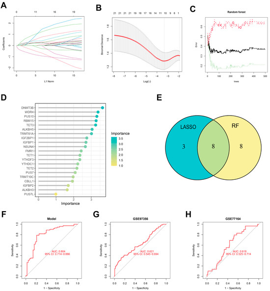 Identification of feature RMGs by Lasso and RF. (A) DEGs profiles based on LASSO coefficients. (B) LASSO coefficient values of the DEGs. The vertical dashed lines are the optimal log(λ) values. (C) The correlation plot between the number of RF trees and model error. (D) The Gini coefficient method in a random forest classifier yielded the following results. The importance index is on the x-axis, and the genetic variable is on the y-axis. (E) Venn plot displaying 8 overlapping feature RMGs selected by LASSO regression algorithm and random forest algorithm. (F–H) Receiver operating characteristic (ROC) curves for 8 feature RMGs in model (F), GSE97356 (G), and GSE77164 (H).