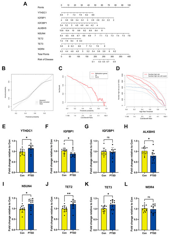 Then, we constructed a nomogram model of the feature RMGs for predicting the risk of PTSD (Figure 4A). Within the nomogram model, each gene is assigned an individual score, and the total score predicting PTSD incidence is calculated by summing these scores. Calibration curves showing strong agreement between predicted and observed out-comes (Figure 4B). The discrepancy between the red line representing the RMGs in the decision curve and the gray and black lines is apparent (Figure 4C). Furthermore, the clinical impact curve also demonstrated that the model provided strong predictive capability for prognosis (Figure 4D). Nevertheless, it is imperative to acknowledge the need for further validation utilizing more diverse and larger datasets to substantiate the prognostic precision of the results. To experimentally corroborate our bioinformatic findings, we performed RT-qPCR to assess the expression of the feature genes. YTHDC1, NSUN4 and TET2/3 in PTSD have higher expression compared to Con. Conversely, IGFBP1 and ALKBH5 showed lower expression in the PTSD compared to Con. There was no statistically significant difference in the expression level of other feature RMGs (Figure 4E–L). These findings were in alignment with part of bioinformatics analysis.