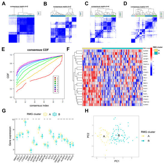 Two distinct RNA modification patterns, RMG clusterA and RMG clusterB, were identified according to 21 differential RMGs through the utilization of the R package “ConsensusClusterPlus” (Figure 5A–E). RMG clusterA consisted of 23 cases, while RMG clusterB comprised 48 cases (Table S2). Subsequently, a heat map (Figure 5F) and histogram (Figure 5G) were generated to visually illustrate the variances in expression levels of the 21 differential RMGs between the two subtypes. It was noted that the expression levels of RBM15, CBLL1, YTHDC1, YTHDF3, FMR1, DNMT3B, TET1, TET2, TRMT10C, ALKBH3, PUS7, PUS7L, and PUS10 in RMG clusterA were higher compared to RMG clusterB. Conversely, the expression levels of IGFBP2, IGF2BP1, ALKBH5, and TRMT61A exhibited significantly higher differences in clusterB (Figure 5F,G). Additionally, the results of PCA indicated that the two RMG patterns could be differentiated based on differential RMGs (Figure 5H).