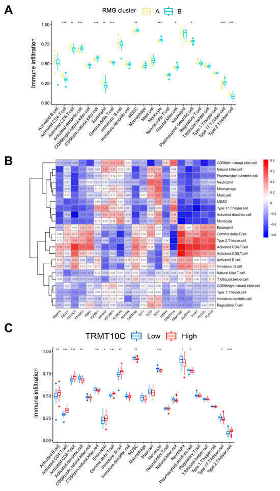 Analysis based on ssGSEA results. (A) Discrepancies in the infiltration of immune cells between RMG cluster A and RMG cluster B. (B) An immuno-correlation analysis revealing the relationship between immune cells and RMGs, with TRMT10C showing the strongest association with immune cells. (C) Differential immune cell infiltration between groups with lower and higher TRMT10C expression. Statistical annotations: * p < 0.05, ** p < 0.01, and *** p < 0.001.