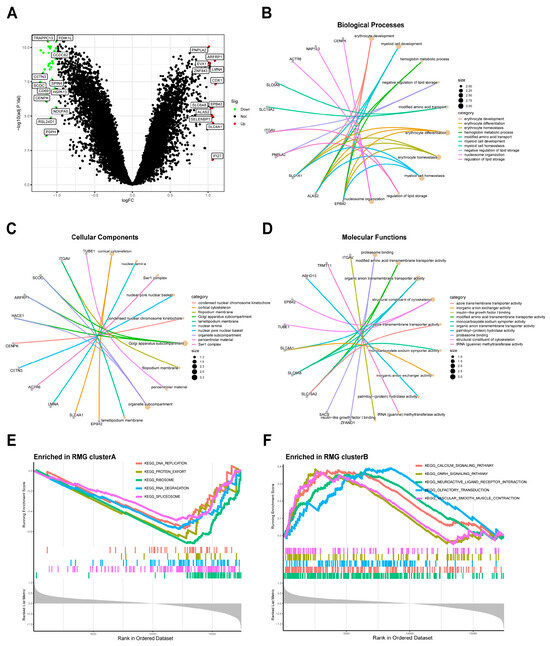 Identification and GO enrichment analysis of DEGs between two modification subtypes. (A) Volcano plot: The volcano plot was constructed using the logFC and Val. p-adjust. Red dots indicate upregulated genes; green dots indicate downregulated genes. (B) Top 10 enrichment terms in BP categories. (C) Top 10 enrichment terms in CC categories. (D) Top 10 enrichment terms in MF categories. (E,F) GSEA was conducted to analyze the enrichment levels of signaling pathways in the two clusters. The enrichment score line chart displays the running enrichment score on the vertical axis against the sorted genes on the horizontal axis. The highest point on the line chart represents the enrichment score of the gene group, with the gene preceding the peak being the central gene within the group. Genes within the group are indicated by lines in the center of the chart.